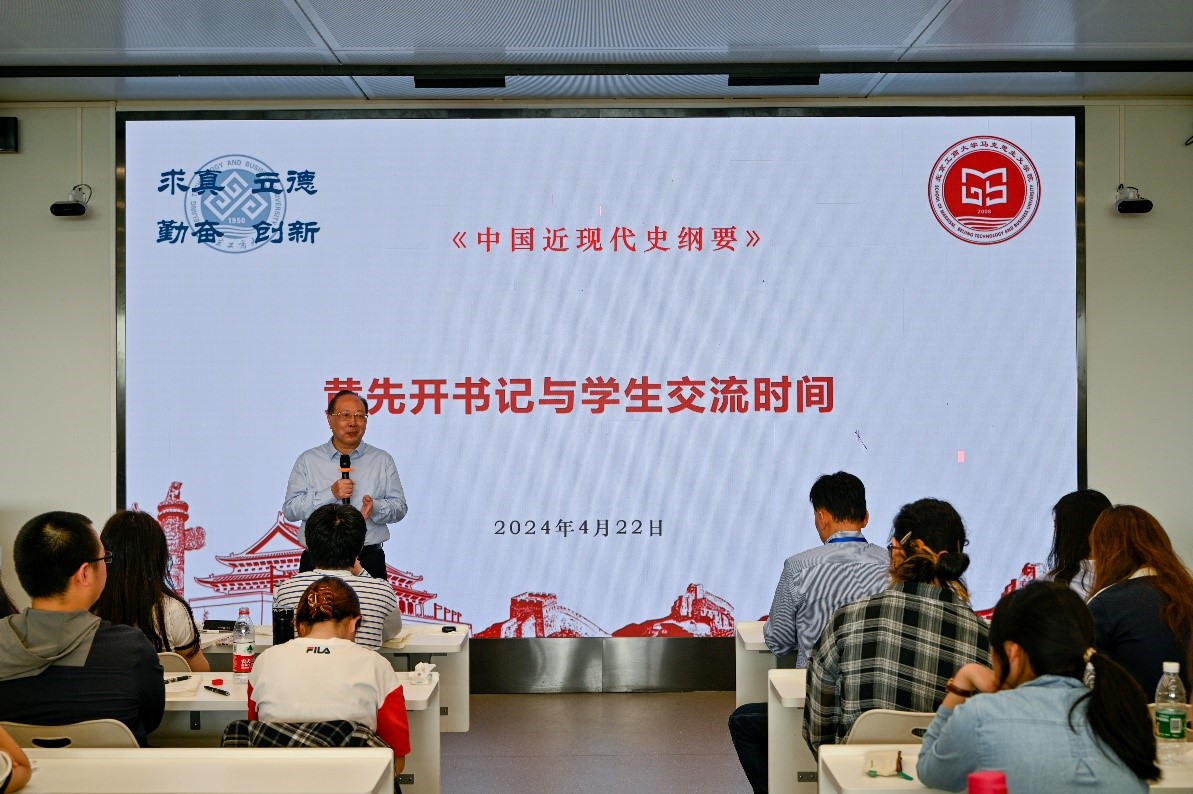 4月22日,學校黨委書記黃先開走進《中國近現代史綱要》課堂,以“面對面交流”形式為百名學生上了一堂生動的思政課。
