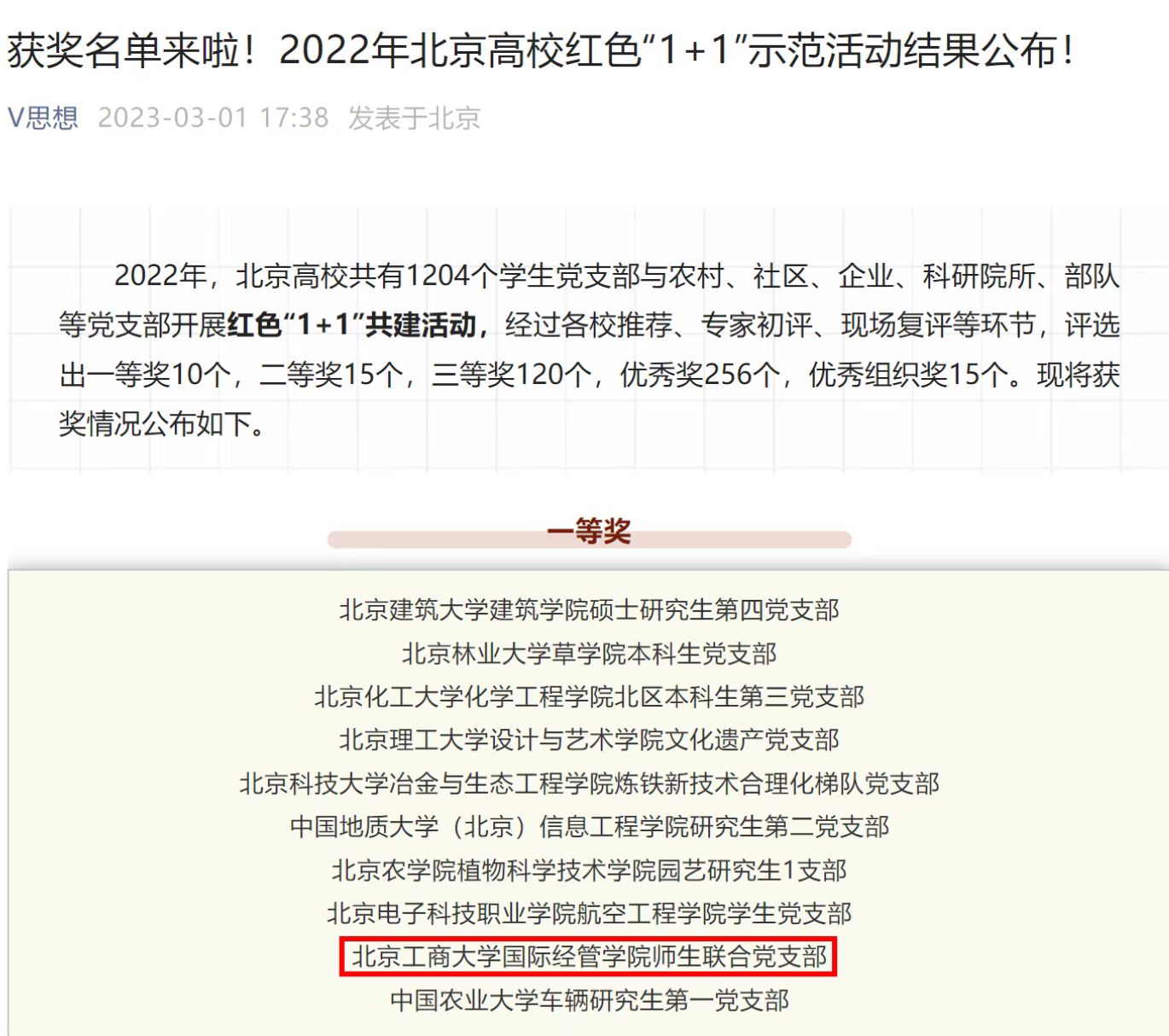 近日,北京市委教育工委公布了2022年北京高校紅色“1+1”示范活動評比結果,北京高校共有1204個學生黨支部與農村、社區、企業、科研院所、部隊等黨支部開展紅色“1+1”共建活動,經過各校推薦、專家初評、現場復評等環節,我校5支黨支部獲得市級獎勵。國際經管學院師生聯合黨支部從北京高校1204個黨支部中脫穎而出,斬獲一等獎,經濟學院金融本科生黨支部榮獲三等獎,生態環境學院研究生專碩黨支部、商學院人力營銷本科生黨支部、輕工科學技術學院生物工程本科生黨支部獲得優秀獎。