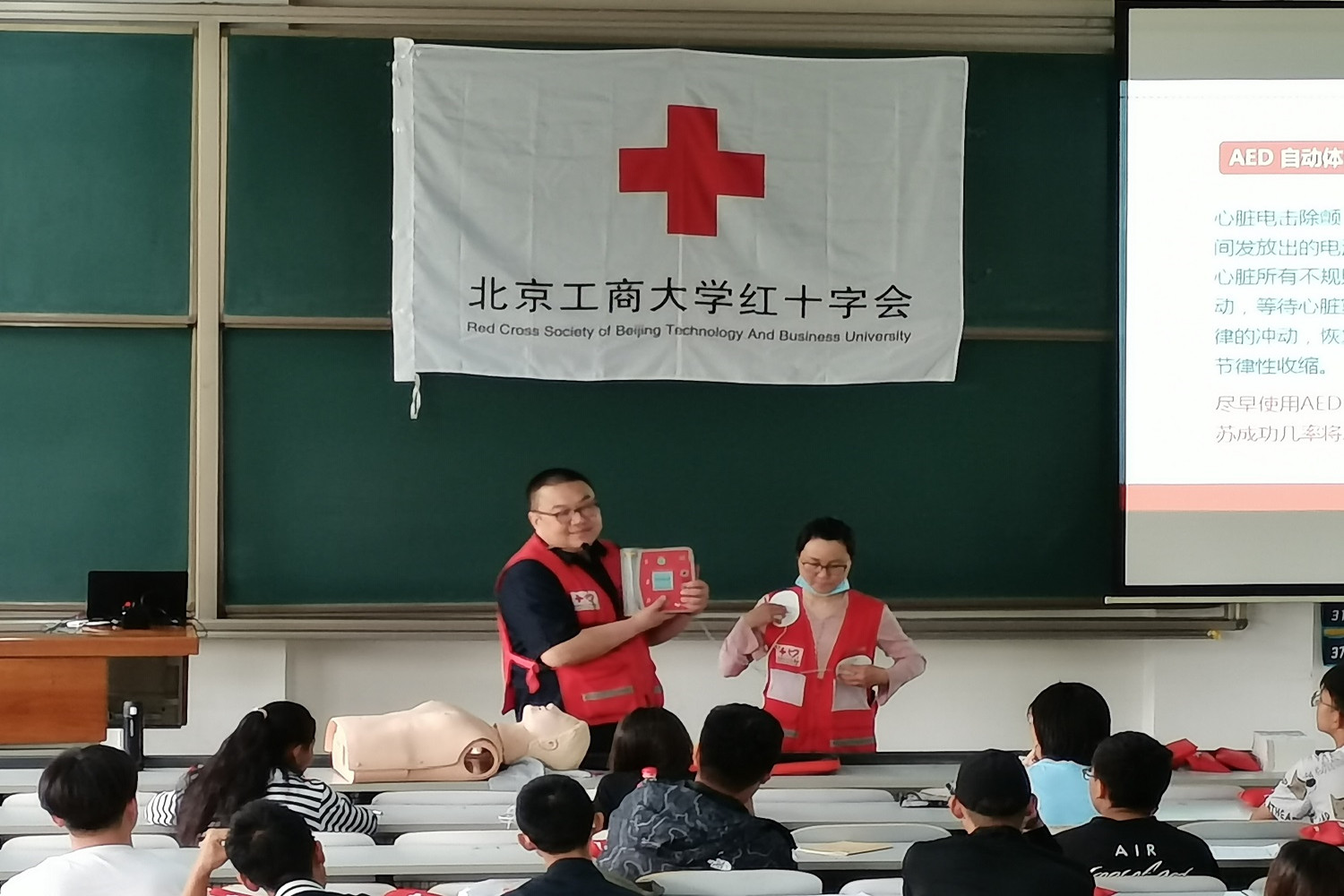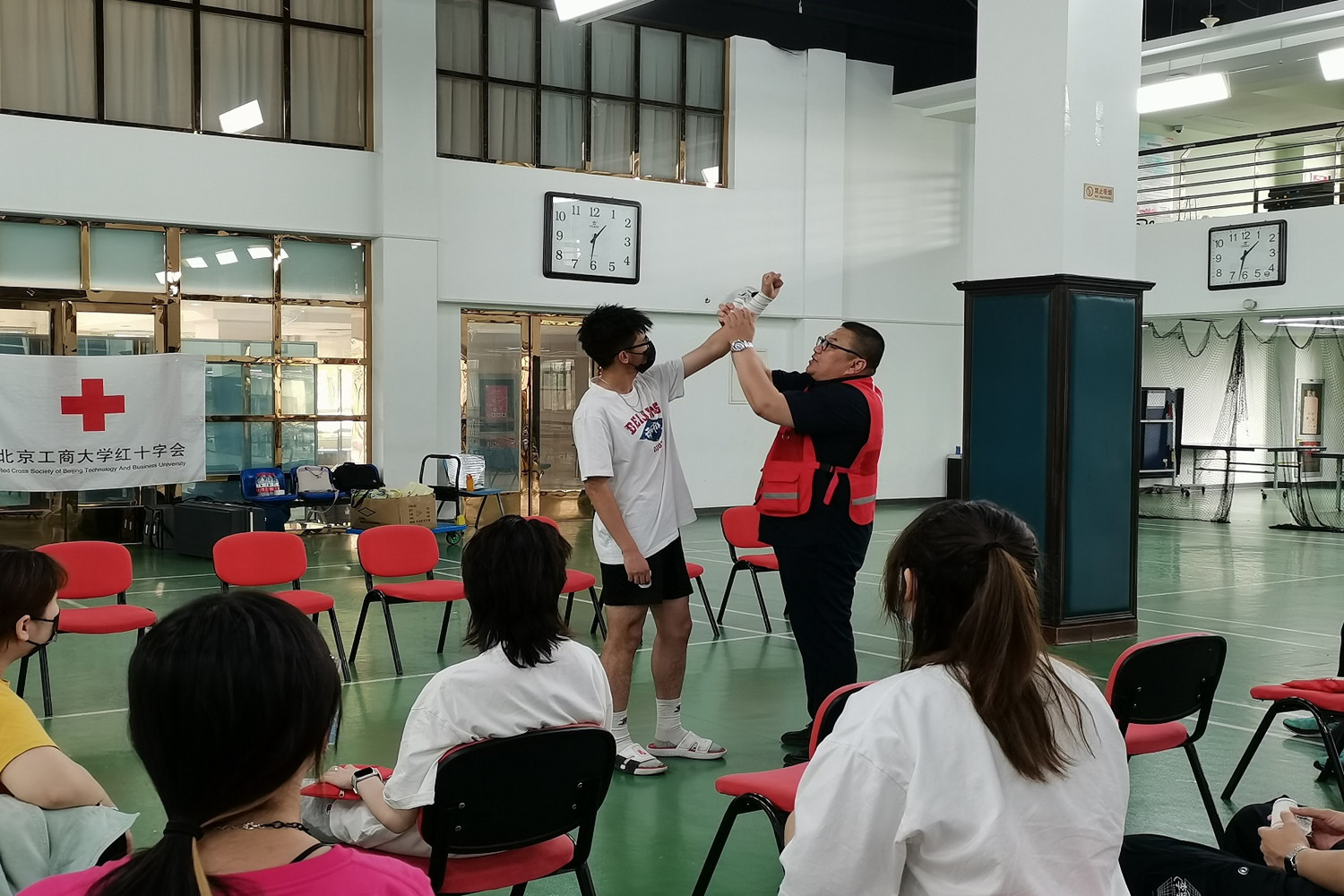 在理論教學中,來自房山區紅十字會的陳錦利為同學們普及了急救基礎知識。他立足于真實案例,深入淺出的講授了緊急救護的基本知識、救護概論,心肺復蘇(含AED的使用)、氣道異物梗阻、創傷救護基本技能等內容。各位老師相互配合,為現場同學演示了氣道異物梗阻的急救實際操作流程。