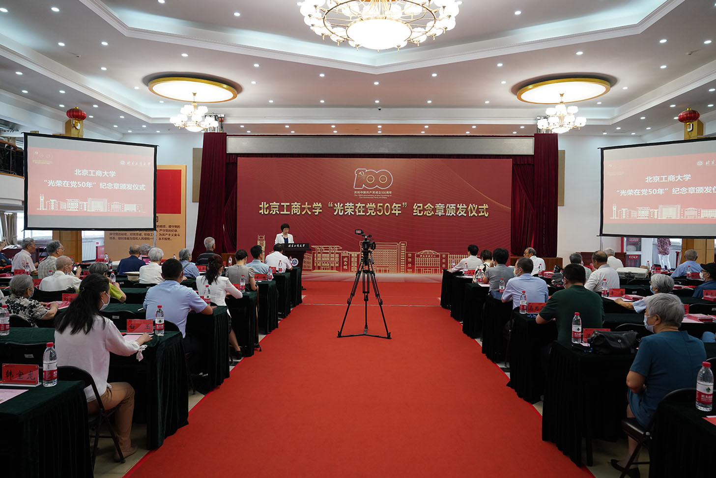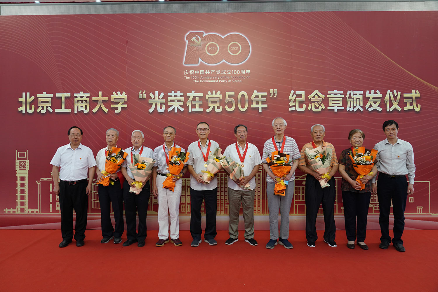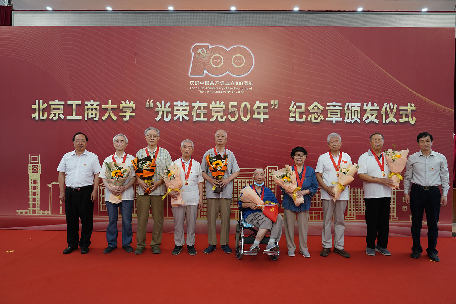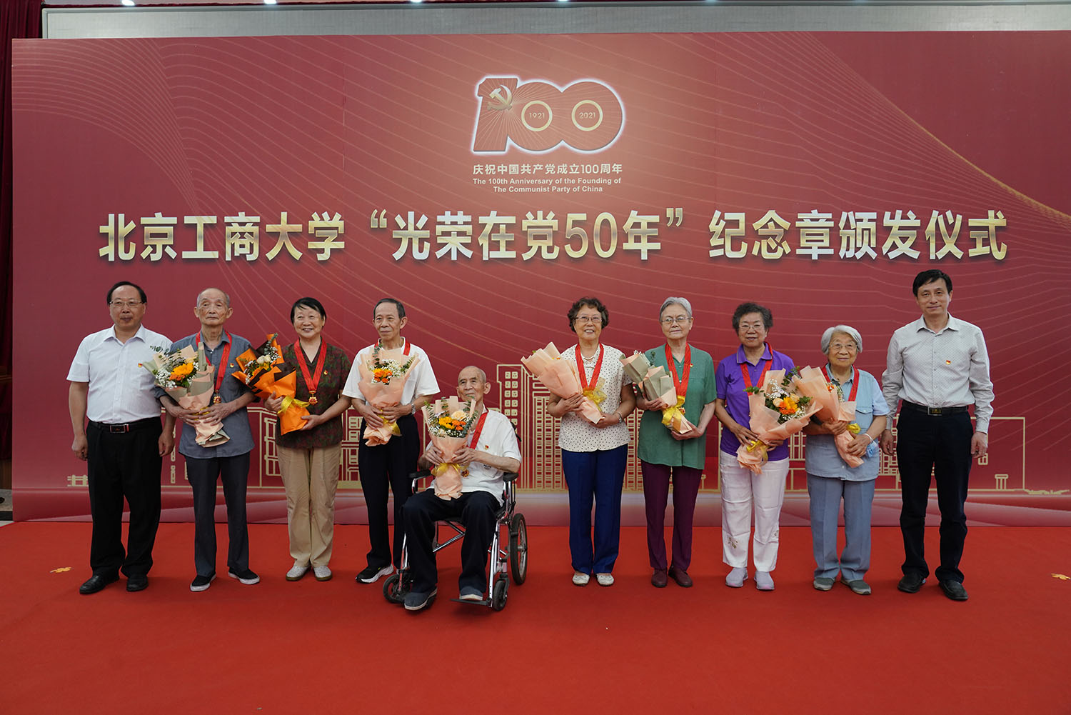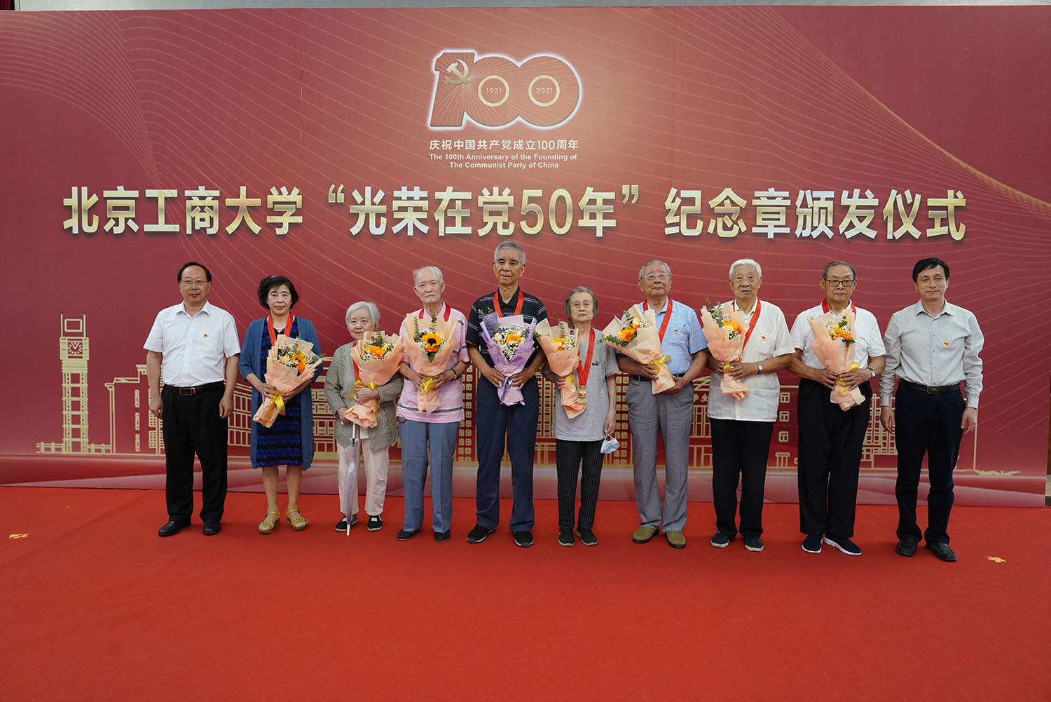 6月29日,北京工商大學“光榮在黨50年”紀念章頒發儀式在阜成路校區隆重舉行。學校黨委書記黃先開、副書記王偉,62名“光榮在黨50年”老黨員代表出席儀式。離退休工作領導小組成員、各支部書記和支部委員代表,以及食品與健康學院師生黨員代表參加儀式。