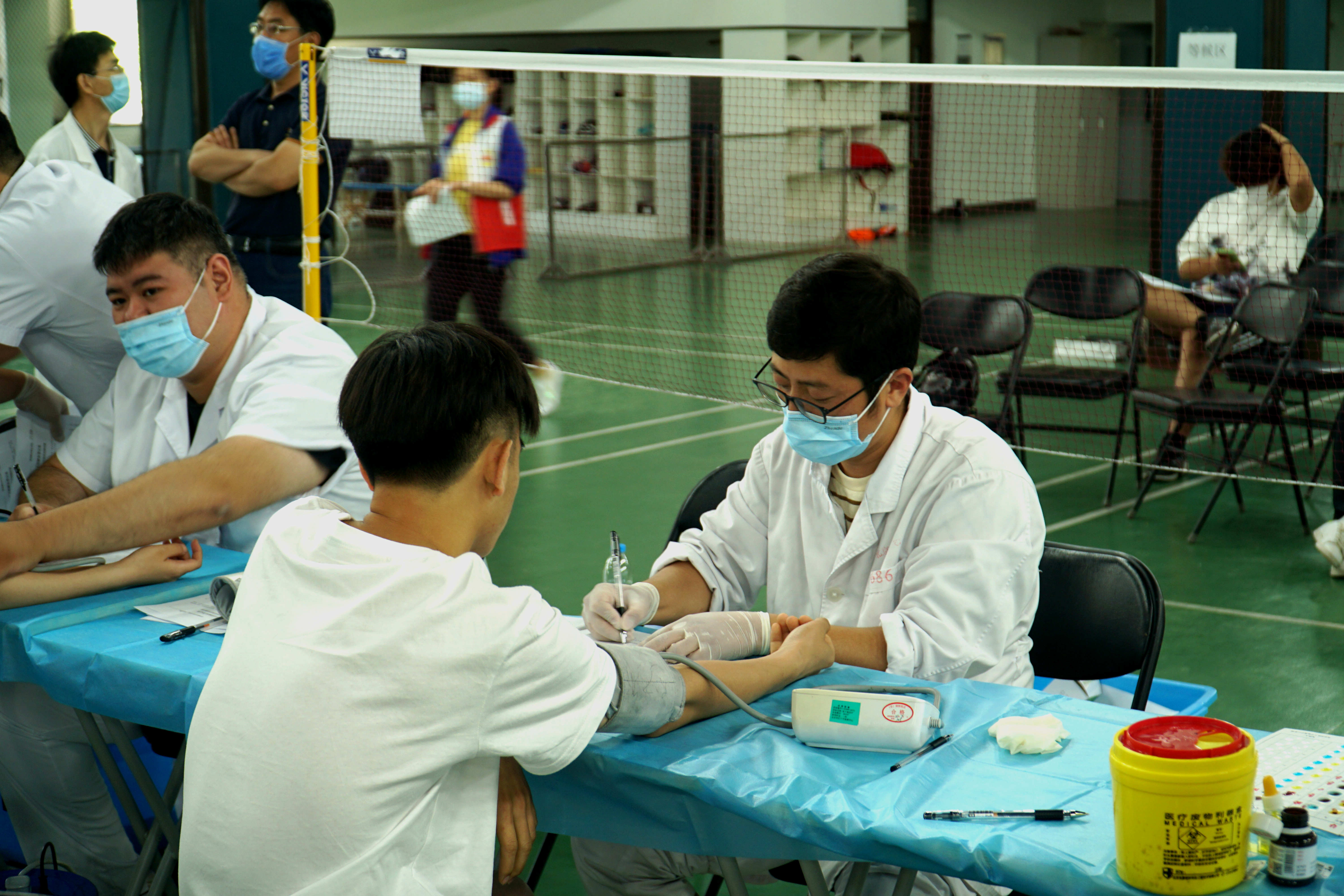 忙碌于現場的“紅馬甲”志愿者們也是現場一道亮麗的風景線。他們一遍又一遍地重復著“枯燥”的工作,盡心盡力,一絲不茍。獻血現場區域劃分明確,設備擺放得井井有條。桌子上擺滿了牛奶、果汁、小面包等可以補充能量的食物供給前來獻血的同學們。對于志愿者們來說,這次獻血活動是服務,也是責任。