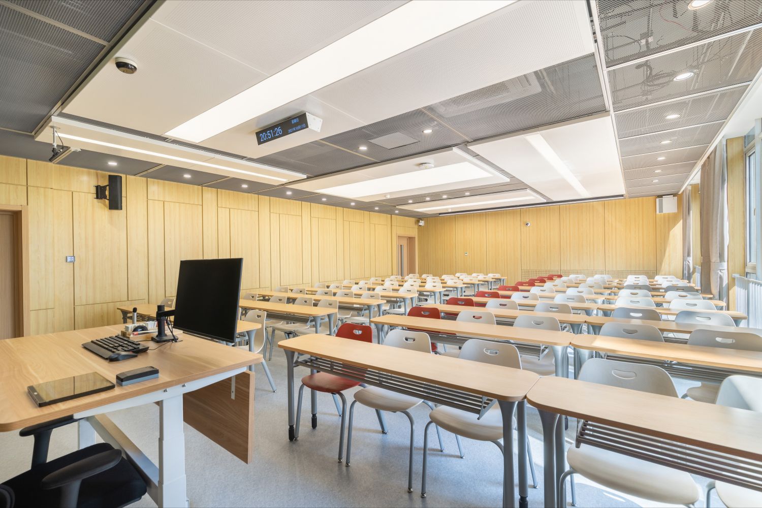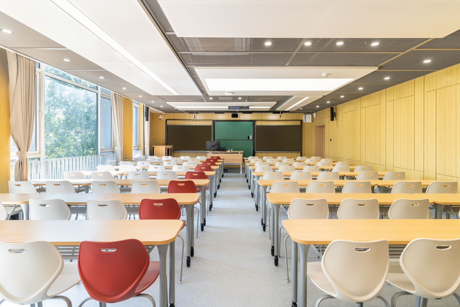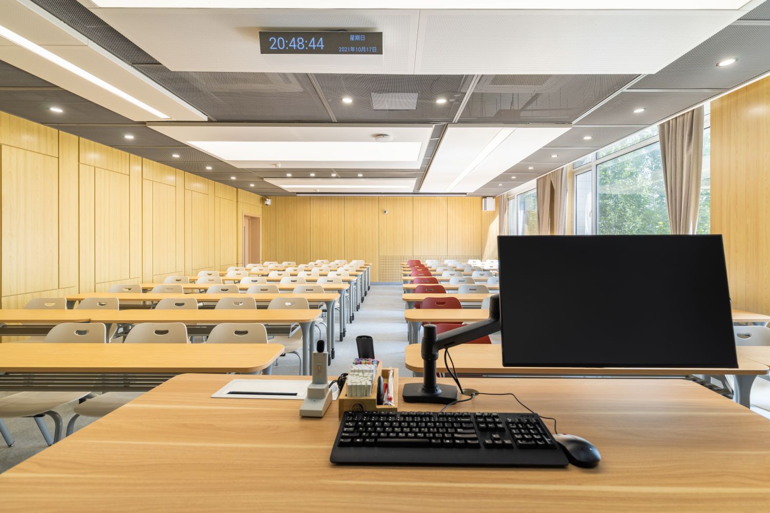 新建智慧教室登錄騰訊便可調用教室內攝像頭,跟蹤教師走動位置,便于線上學生觀看教師授課、板書及互動,實現了線上線下混合式教學;提供了大屏、記憶黑板、電子白板、玻璃白板、實物展臺等多種書寫方式,每間教室黑板多層可推拉,大大增加了書寫面積,實現了自由自主、隨心便捷的書寫模式;考慮到大教室幕布遮擋黑板的情形,中控面板首頁設置了一鍵幕布升降功能,教師可隨手調整幕布升降,免去了遮擋困擾;設置多種擴聲模式,“一師一麥”、“一室一麥”,輔助吊麥,手持買和吊麥在不同區域講話自動切換,教師即使未攜帶任何擴聲設備,也不用擔心授課擴聲問題;電子時鐘雙面顯示,無論教師還是學生微微抬頭便可輕松觀看時間;教室內教師機顯示器采用大屏超薄配置,可觸控、可書寫,自帶隱藏式攝像頭,360度可旋轉,便利教師教學;教室內使用U盤錄制的課堂實錄,下課拔走即帶走,無需手動下載;教師講臺可升降,配有無塵膜衣粉筆、硬質粉筆、軟質粉筆、噴水板擦、干濕兩用板擦、電子教鞭、眼鏡收納,講臺邊配有水杯托、衣帽鉤,學生桌椅也配有桌斗,方便師生放置個人物品。類似的人性化設計細節還有很多,教務處始終秉持教學服務沒有止境的理念,用心設計和處理每一處細節,也將在后續教學過程中不斷聽取師生的使用意見反饋,積累完善,精益求精。