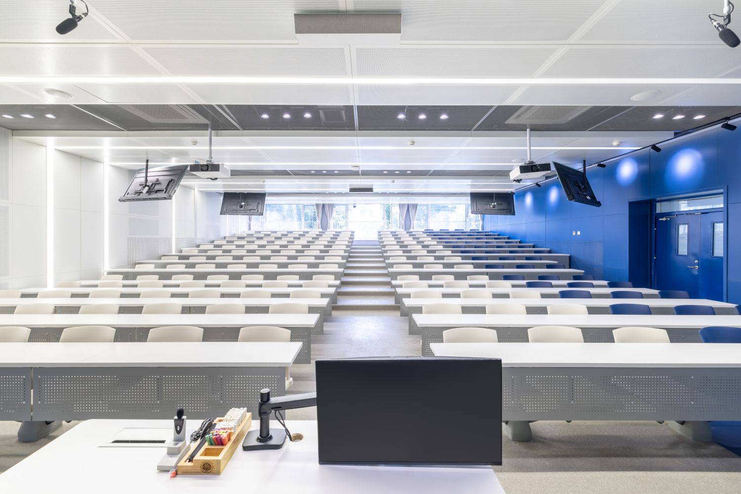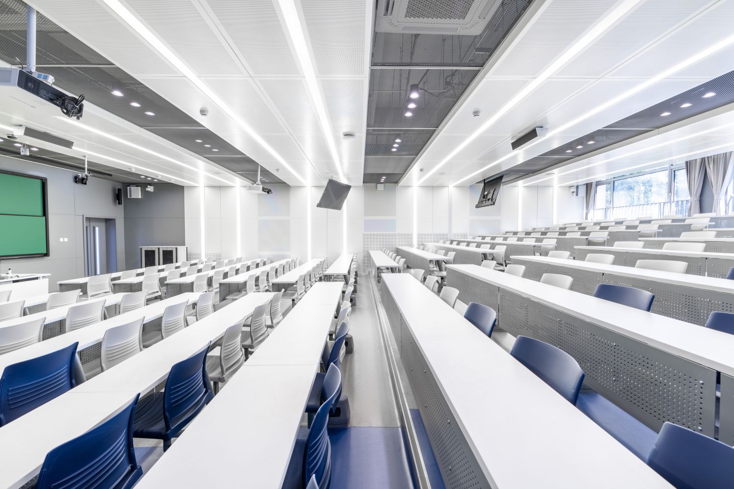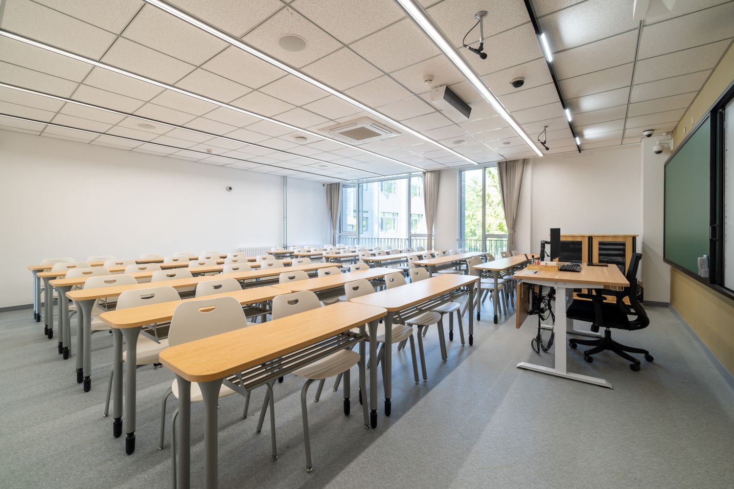 新建智慧教室登錄騰訊便可調用教室內攝像頭,跟蹤教師走動位置,便于線上學生觀看教師授課、板書及互動,實現了線上線下混合式教學;提供了大屏、記憶黑板、電子白板、玻璃白板、實物展臺等多種書寫方式,每間教室黑板多層可推拉,大大增加了書寫面積,實現了自由自主、隨心便捷的書寫模式;考慮到大教室幕布遮擋黑板的情形,中控面板首頁設置了一鍵幕布升降功能,教師可隨手調整幕布升降,免去了遮擋困擾;設置多種擴聲模式,“一師一麥”、“一室一麥”,輔助吊麥,手持買和吊麥在不同區域講話自動切換,教師即使未攜帶任何擴聲設備,也不用擔心授課擴聲問題;電子時鐘雙面顯示,無論教師還是學生微微抬頭便可輕松觀看時間;教室內教師機顯示器采用大屏超薄配置,可觸控、可書寫,自帶隱藏式攝像頭,360度可旋轉,便利教師教學;教室內使用U盤錄制的課堂實錄,下課拔走即帶走,無需手動下載;教師講臺可升降,配有無塵膜衣粉筆、硬質粉筆、軟質粉筆、噴水板擦、干濕兩用板擦、電子教鞭、眼鏡收納,講臺邊配有水杯托、衣帽鉤,學生桌椅也配有桌斗,方便師生放置個人物品。類似的人性化設計細節還有很多,教務處始終秉持教學服務沒有止境的理念,用心設計和處理每一處細節,也將在后續教學過程中不斷聽取師生的使用意見反饋,積累完善,精益求精。
