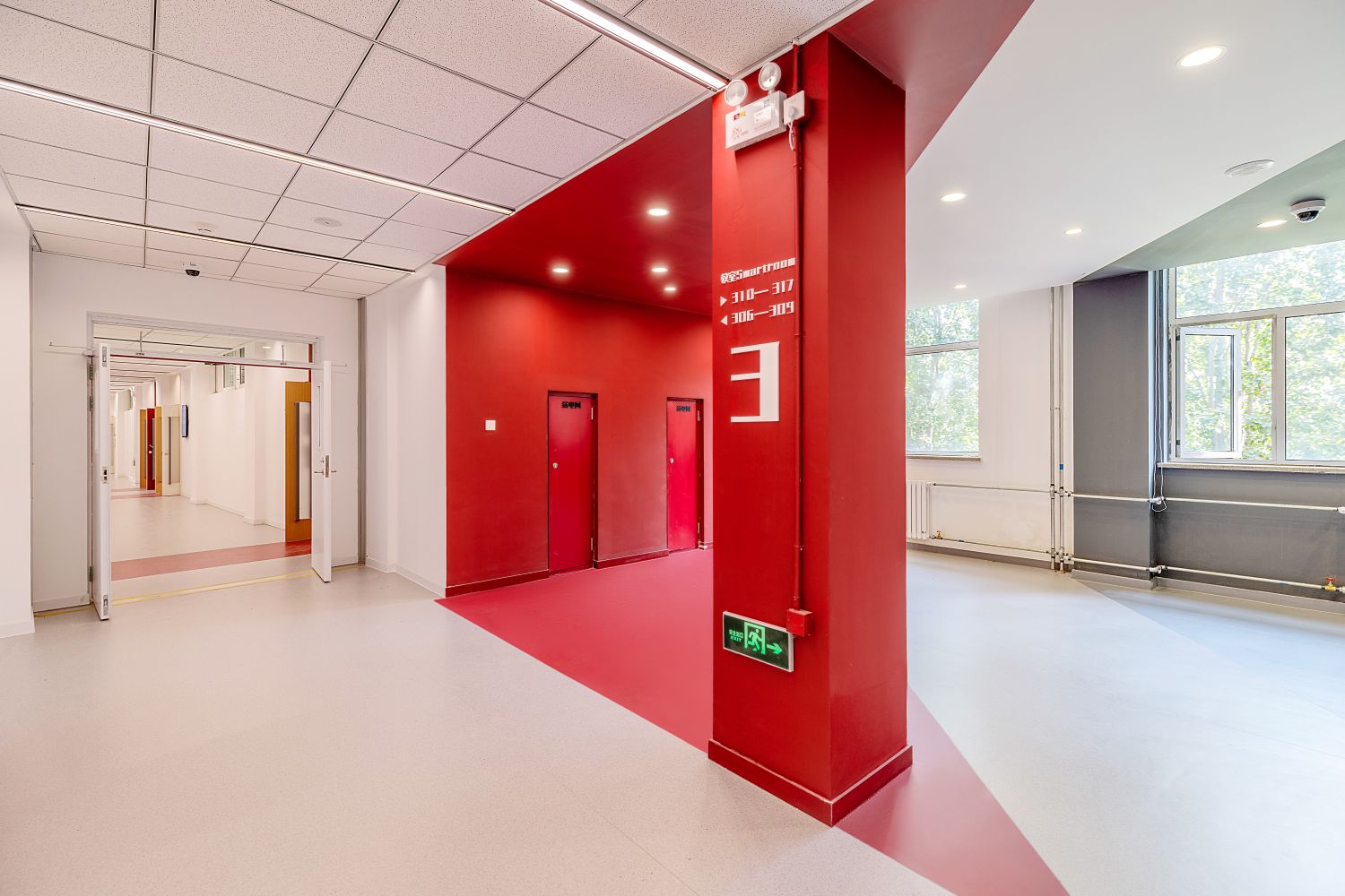 文二樓二、三層的精品教室以木色為主題色,并在家具上點綴樓層主題色,使教室內與公共空間呼應結合。四層的特色學科教室則按照各學科院色區分,使學生對所在的學習環境及學科專業產生歸屬感。四層新工科階梯教室則采用食品與健康學院綠色;新商科階梯教室的主題色采用商學院的紅色;藝術類階梯教室主題色采用傳媒與設計學院的藍色。