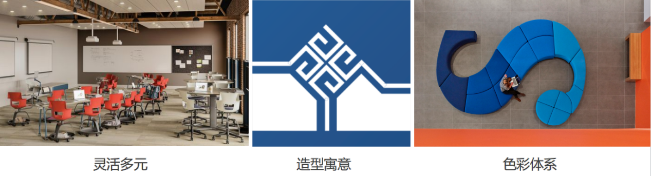 挖掘文化內涵,突出“工商融合”的設計思路。本次設計學習空間類型因更加豐富、靈活、多元,空間界面、靈活家具、設備設施的緊密結合設計,將發揮傳統教學所無法替代的功能與體驗。設計語言汲取學校校徽中的折線設計理念,結合工商首字母“G”與“S”的形式,在室內設計界面進行細化與升華,營造具有北工商校園特色文化的空間環境。空間色彩體系上呼應本校作為高水平研究型大學的發展目標,以學校標準色為基礎,結合各學科標志色融合設計,突出鮮明的校園文化特征及多元化的學科特色。