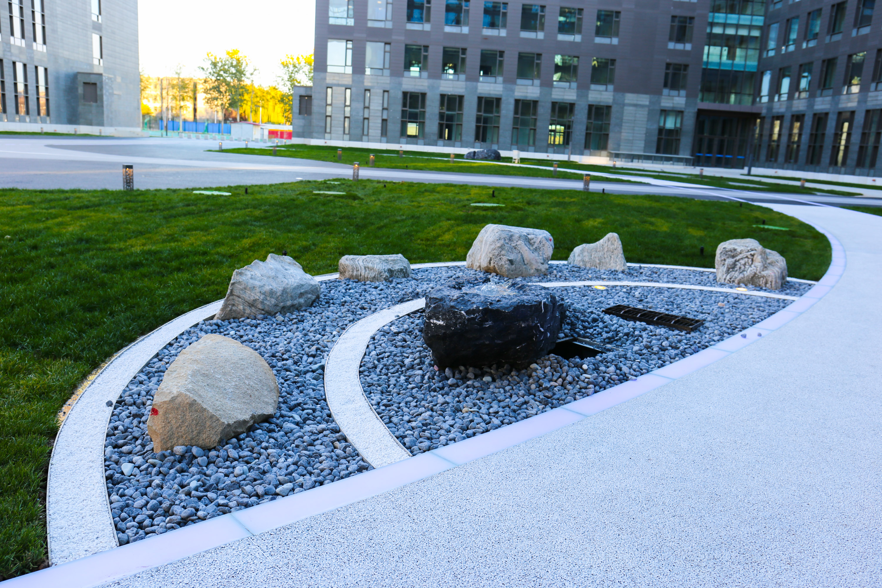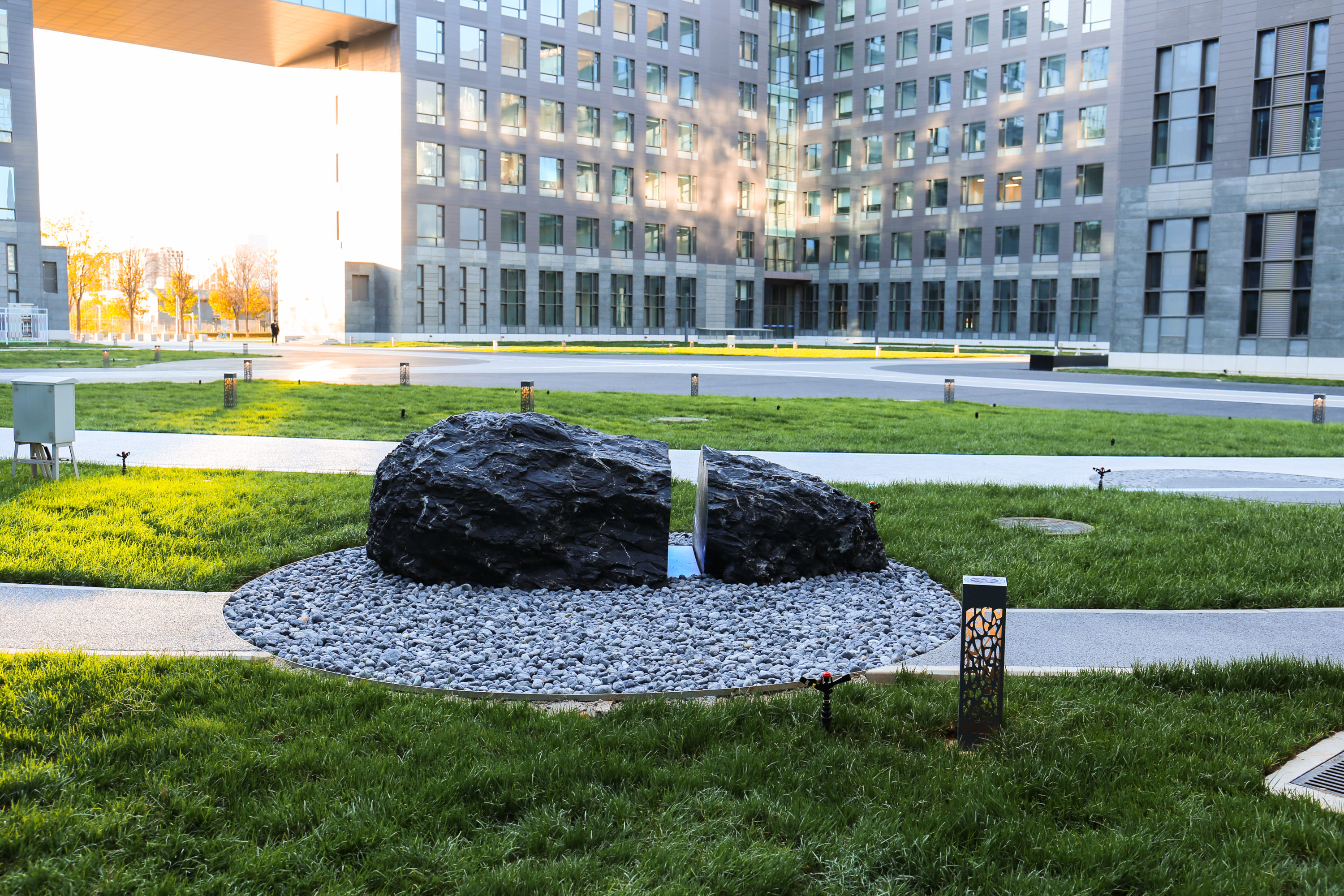 “工商之環(huán)”坐落在良鄉(xiāng)主校區(qū)輕工食品大樓的中庭里,銜接起了A座B座兩棟大樓,南北向的道路連接兩座大樓,東西向的道路向外延伸,連接中、西校區(qū);圓形的道路連接綠意盎然的三片草坪,環(huán)繞著如啟明星一般的中央?yún)^(qū)域。綠色的草坪完美柔和了四周的混凝土建筑,凸顯出生機(jī)之美,為校園增添了一處兼具自然美景與人文藝術(shù)魅力的休閑場所。