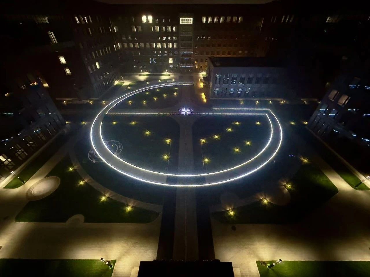 在節(jié)點(diǎn)設(shè)計上,庭院以“工商”的拼音大寫首字母“GS”構(gòu)成燈光景觀,圍繞環(huán)形輔路鋪設(shè)。工商之環(huán)在夜晚指引著道路,讓學(xué)生在科研結(jié)束后孤寂的夜也不再迷茫。