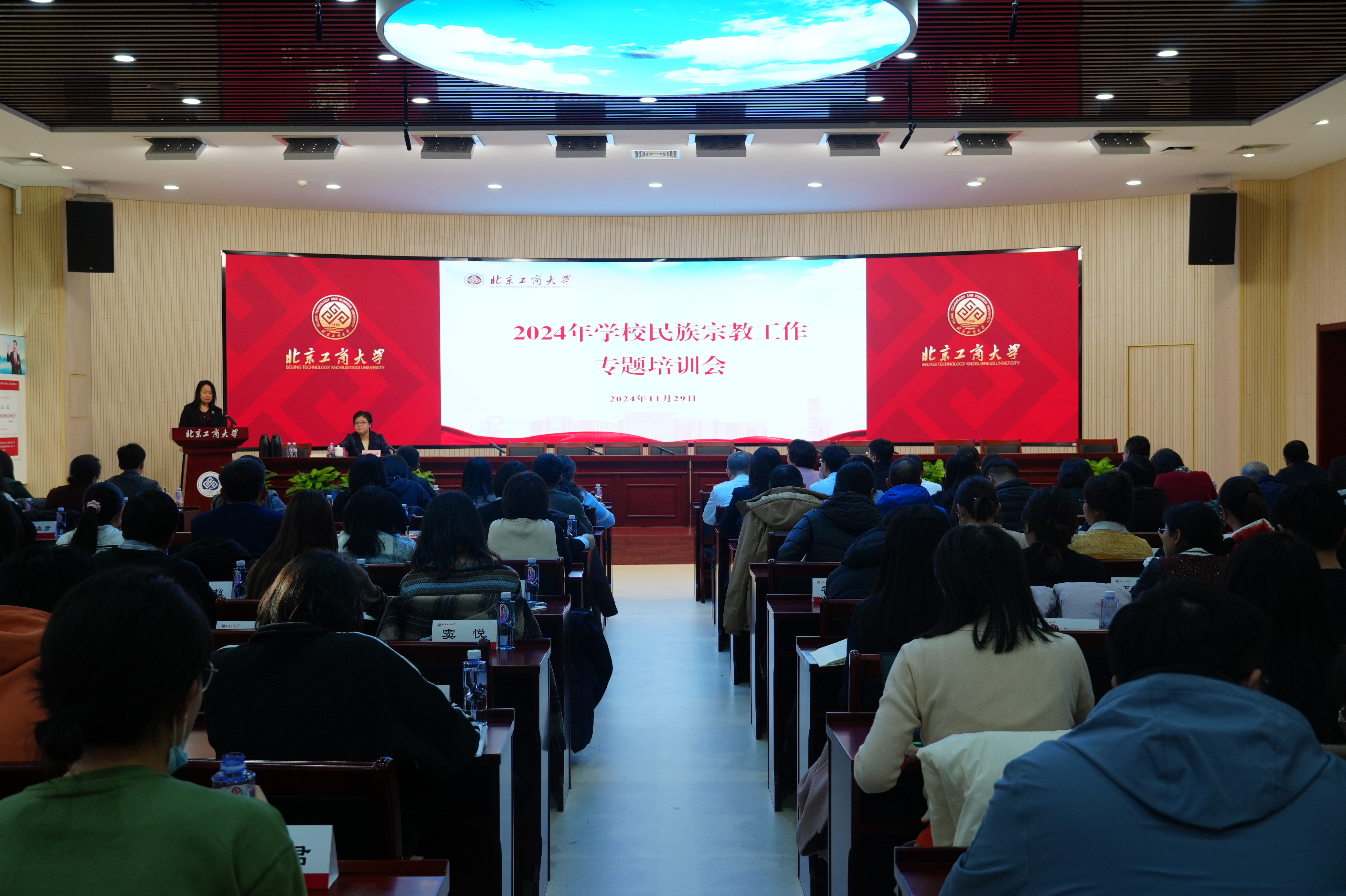 為深入學習領會習近平總書記關于做好新時代黨的統一戰線工作的重要思想,貫徹落實好中央民族工作會議精神和全國宗教工作會議精神,切實提升基層組織和干部隊伍推動工作的能力素質,11月29日,學校舉辦2024年民族宗教工作專題培訓會。北京市民族宗教事務委員會黨組成員、副主任陳婷婷受邀作專題報告。學校統戰工作領導小組和民族宗教事務工作領導小組成員單位負責人,二級黨組織書記、統戰委員,各學院副書記、輔導員,專職組織員,學校黨委教師工作部、黨委學生工作部、黨委研究生工作部、黨委保衛工作部、公共事務處等部門負責人和干部,新入職教職工、馬克思主義學院專任教師、師生黨支部書記代表等140余人參加培訓。培訓由學校黨委副書記宋曉欣主持。