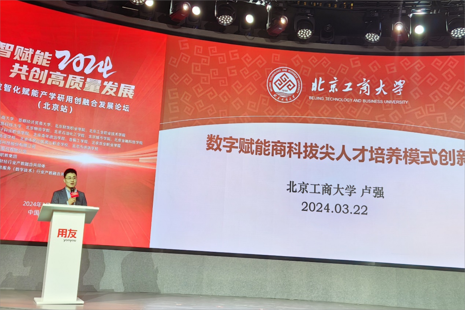 3月22日,教育數智化賦能產學研用創融合發展論壇北京站在用友產業園召開。我校作為主要合作方,與首都經濟貿易大學、北京財貿職業學院、北京工業職業技術學院聯合主辦該論壇。來自北京地區的院校領導、行業專家、知名企業家等近150人聚焦“數智賦能2024共創高質量發展”,共商以數智化賦能教育高質量發展的新內容和新模式,共議高素質數智化人才培養的新路徑和新方法。學校黨委、副校長徐丹丹出席論壇并致辭。