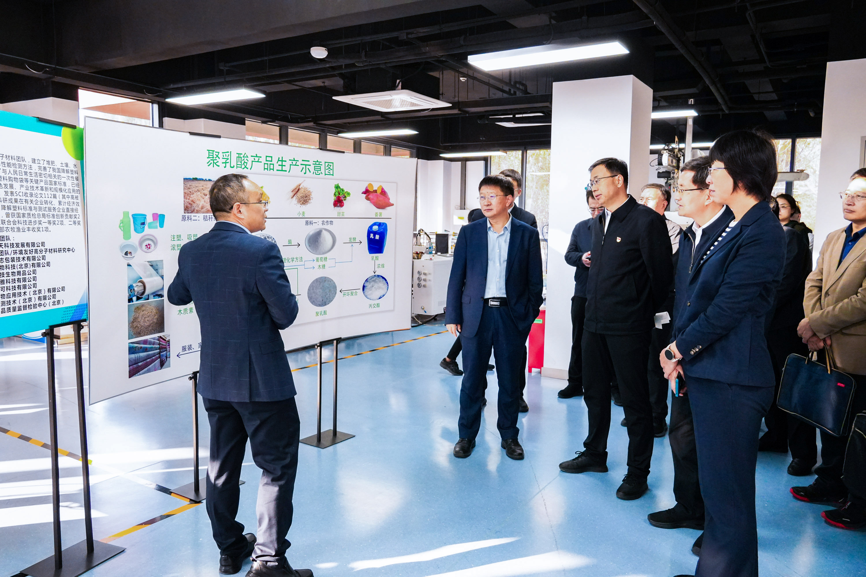 會前,李素芳一行來到良鄉大學城智匯園區,走進北京市可降解生物基材料新型研發中心、研發中心表征實驗室,調研生物降解塑料成品制造、原材料合成與測試等情況;考察北京炎華眾康檢測技術有限公司、惠通北工生物科技(北京)有限公司,了解生物工程原料安全功效評價創新平臺情況;參觀包裝制品展示室,聽取循環箱、生物基托盤等新環保產品研發及應用情況。