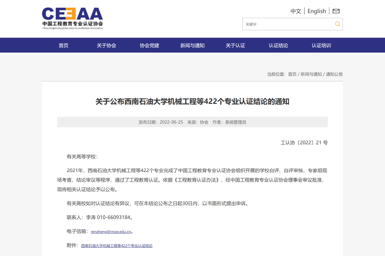 6月25日,中國工程教育專業認證協會網站發布消息《關于公布西南石油大學機械工程等422個專業認證結論的通知》,公布了2021年全國工程教育認證結論,我校食品與健康學院食品科學與工程專業名列其中,順利通過工程教育專業認證。