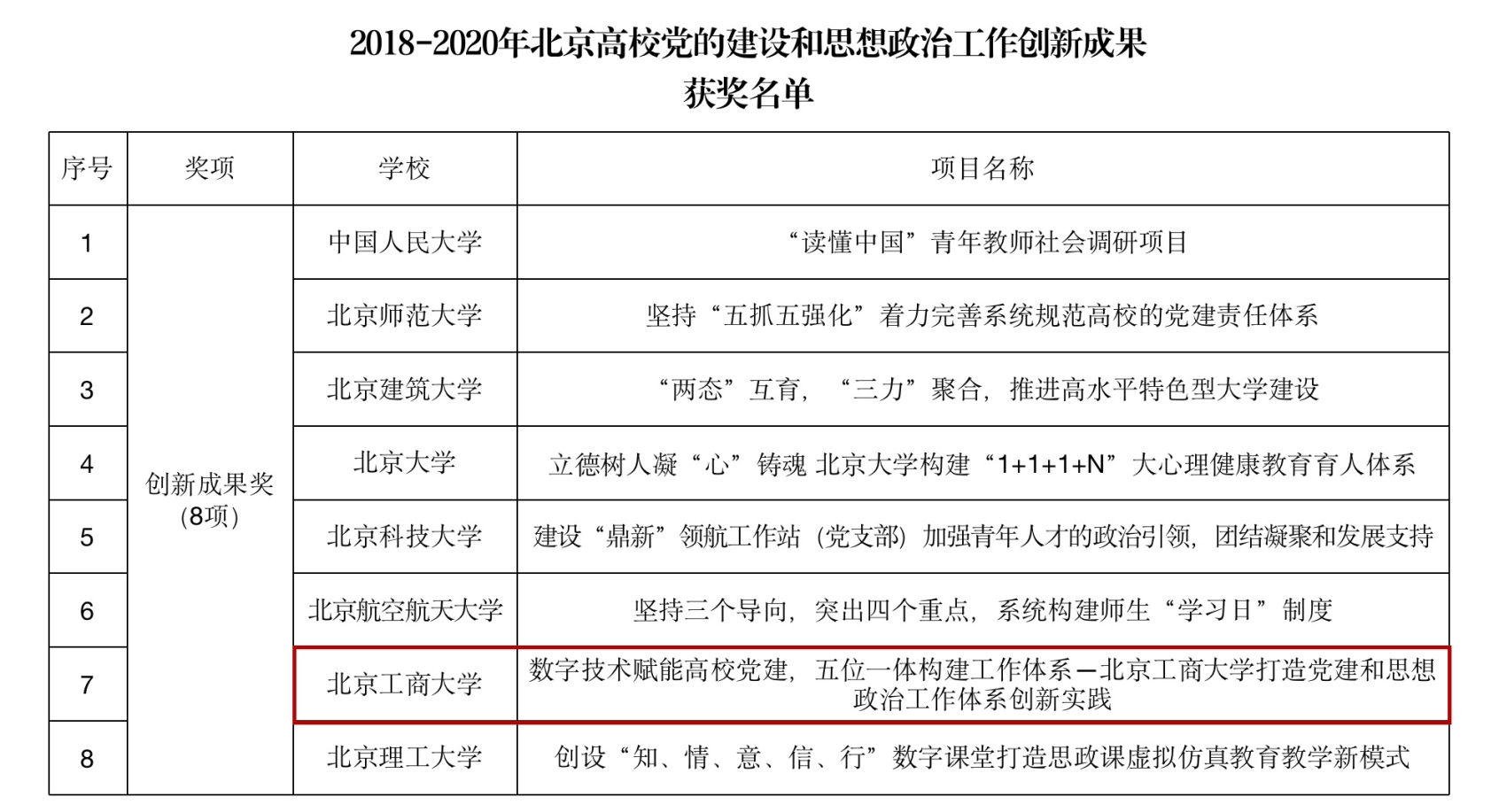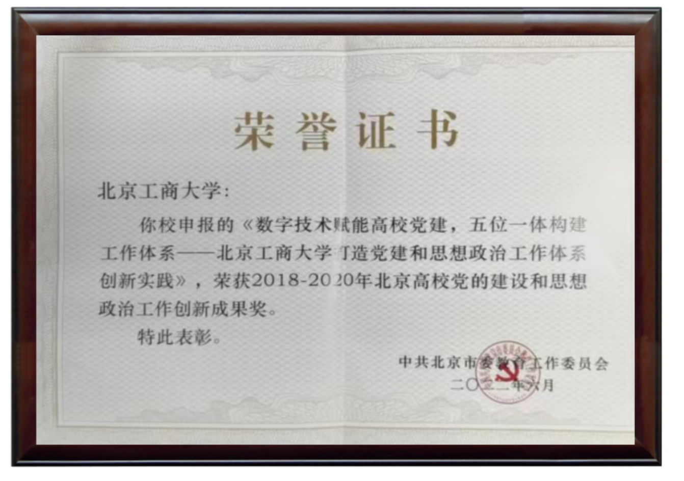 近日,北京市委教育工委公布了2018-2020年北京高校黨的建設(shè)和思想政治工作成果獲獎名單,我校《數(shù)字技術(shù)賦能高校黨建,五位一體構(gòu)建工作體系》成果榮獲創(chuàng)新成果獎。