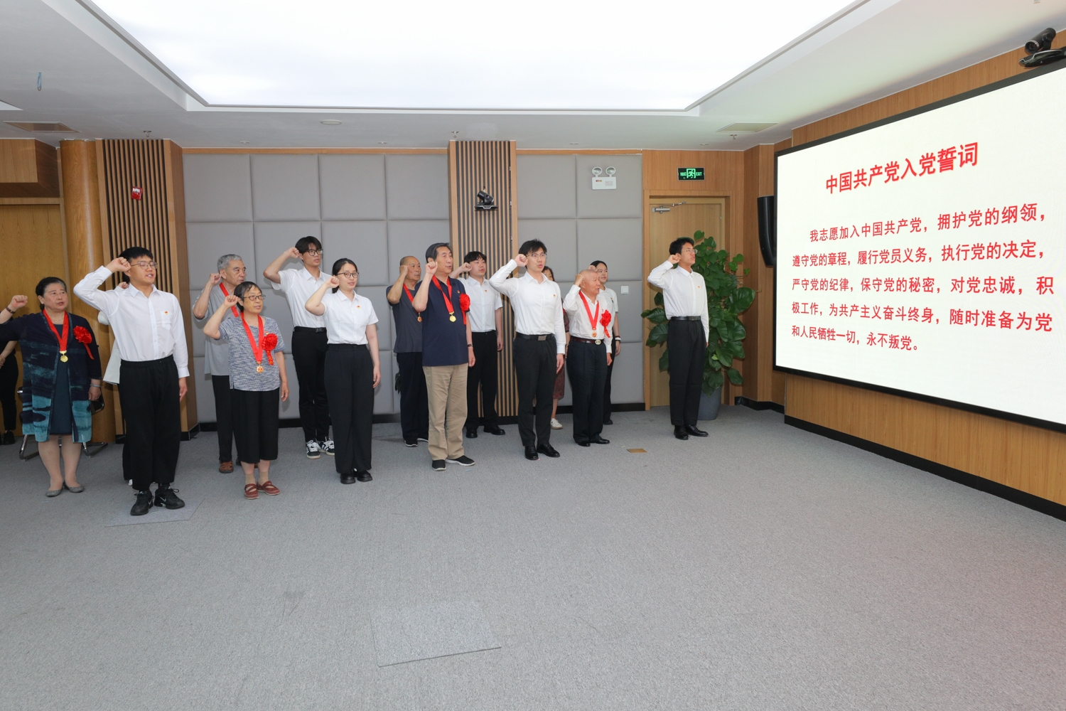 座談之后,舉行黨員徽章佩戴及宣誓儀式。由8位“光榮在黨50年”的老黨員代表為今年新加入黨組織的年輕黨員代表佩戴黨員徽章,新老黨員在黨旗下共同宣誓。