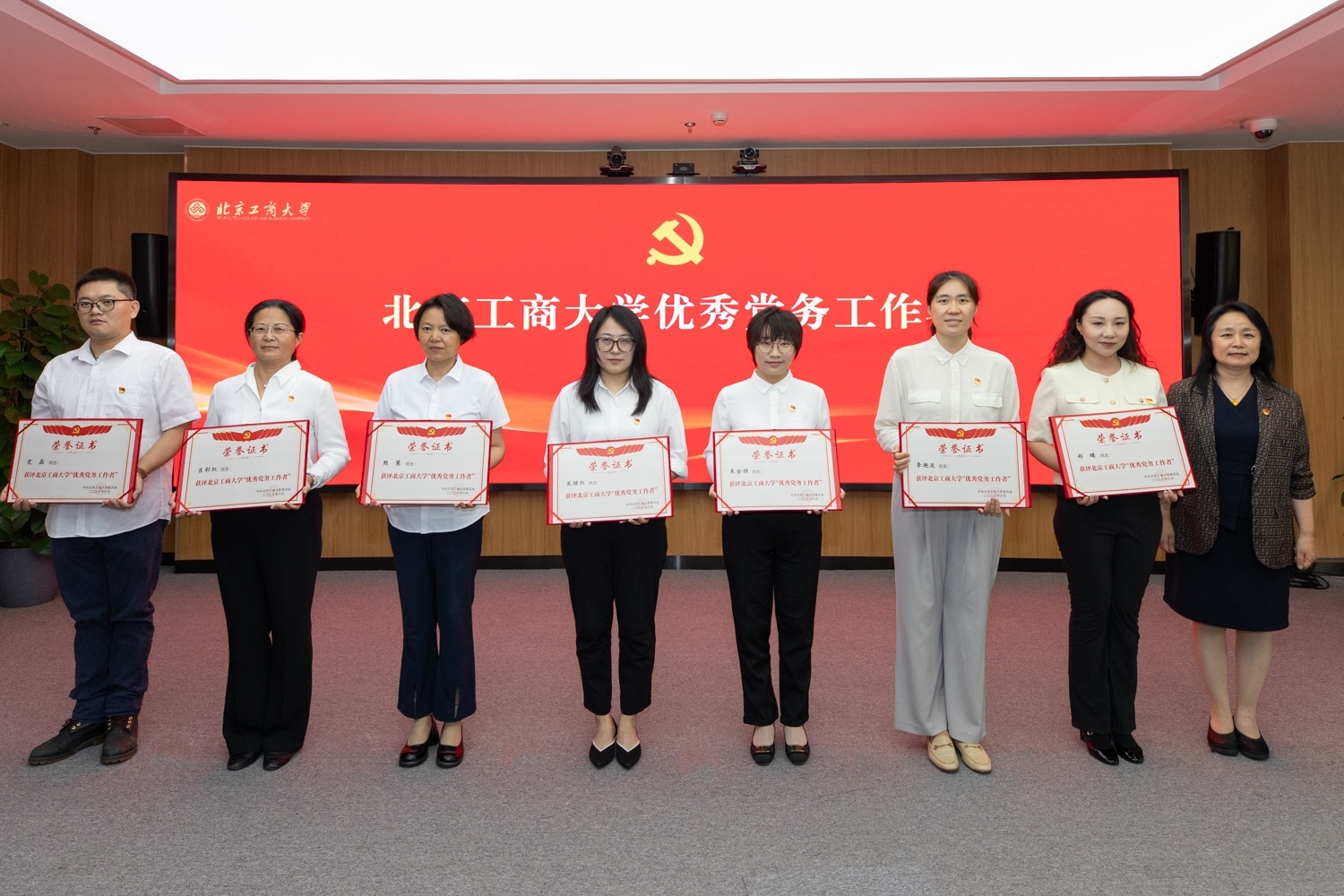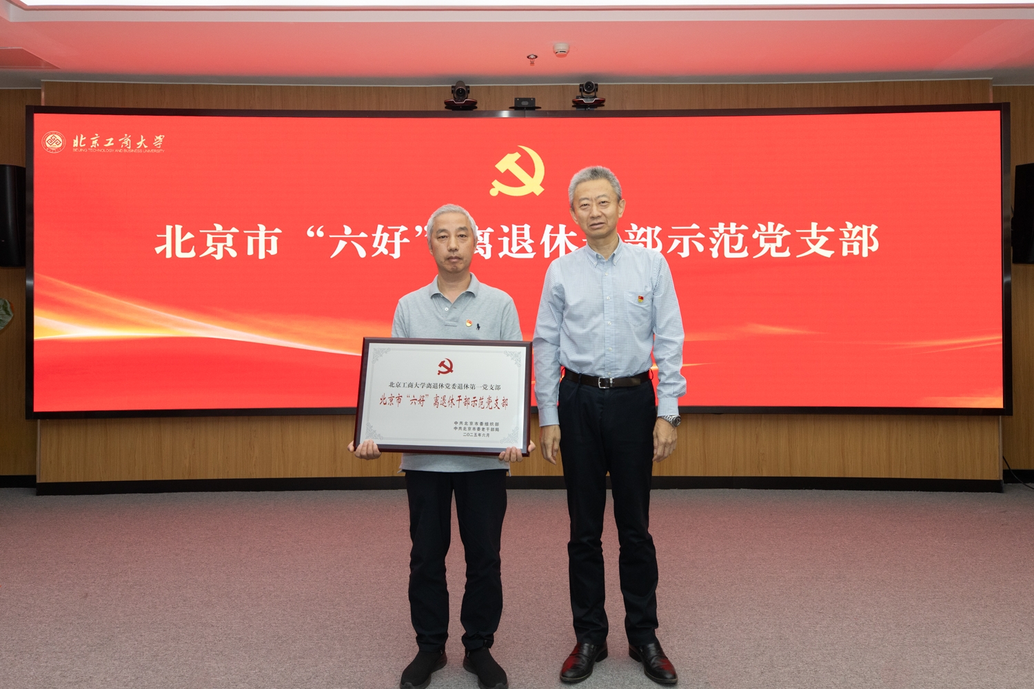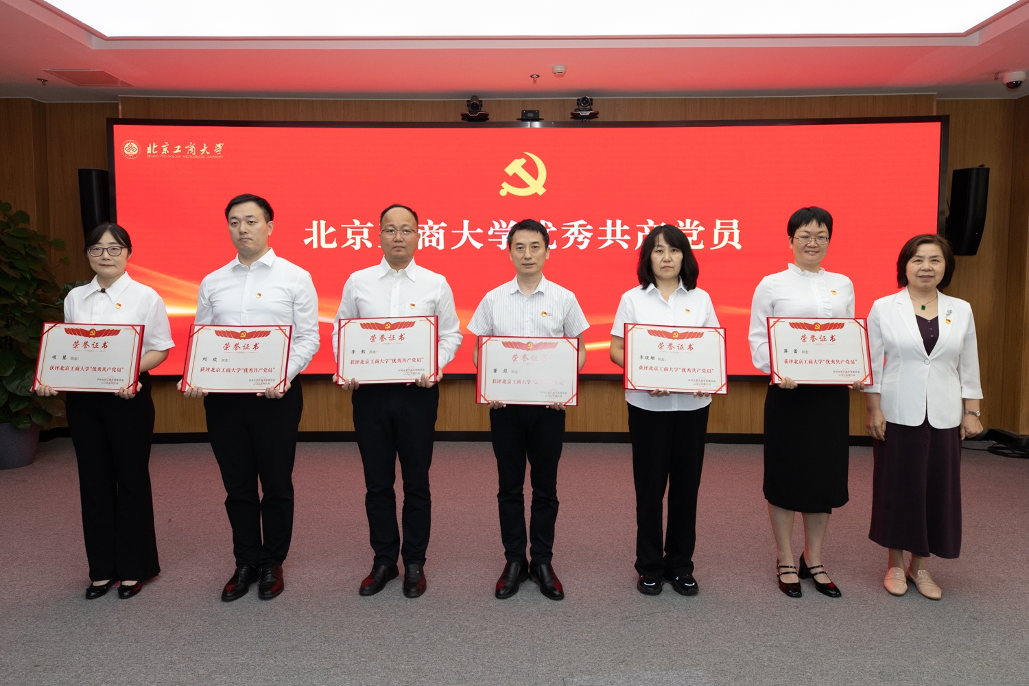 宋曉欣宣讀“光榮在黨50年”紀念章獲得者名單、北京市“六好”離退休干部示范黨支部和學校關于表彰優秀共產黨員、優秀黨務工作者和先進基層黨組織的決定。今年共有22名黨齡達到50周年、一貫表現良好的黨員榮獲“光榮在黨50年”紀念章,離退休黨委退休第一黨支部獲評北京市“六好”離退休干部示范黨支部。經學校黨委研究決定,授予王博等55名同志“北京工商大學優秀共產黨員”稱號,授予王遠芳等20名同志“北京工商大學優秀黨務工作者”稱號,授予機關黨委等20個基層黨組織“北京工商大學先進基層黨組織”稱號。
