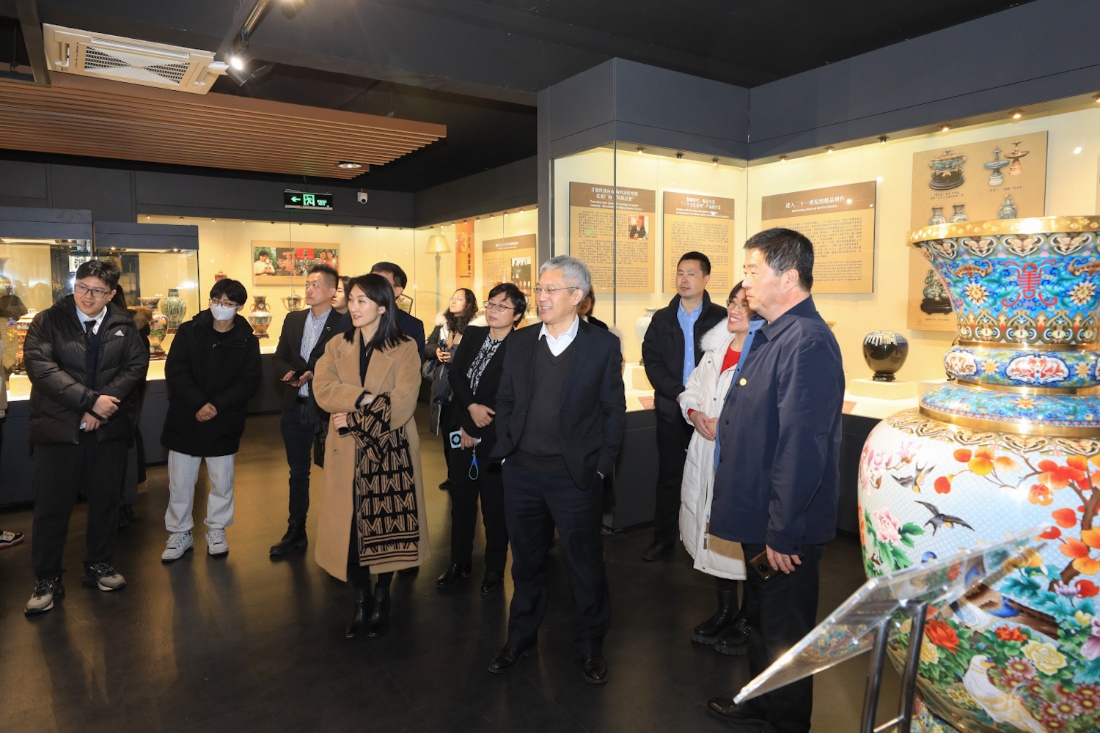 簽約儀式結(jié)束后,李中奇一行在謝燕華的陪同下,參觀中國(guó)景泰藍(lán)博物館和生產(chǎn)車間,深度了解景泰藍(lán)發(fā)展歷史和制作工藝。李中奇在參觀中指出,作為舊時(shí)宮廷獨(dú)享的景泰藍(lán),歷經(jīng)滄桑變革,成為中華民族優(yōu)秀傳統(tǒng)文化的靚麗名片。他鼓勵(lì)同學(xué)們通過了解景泰藍(lán)的發(fā)展歷史,探求中華文明的真諦,體悟?qū)嵺`育人內(nèi)涵,堅(jiān)定對(duì)中華優(yōu)秀傳統(tǒng)文化、對(duì)國(guó)家和民族未來的信心。