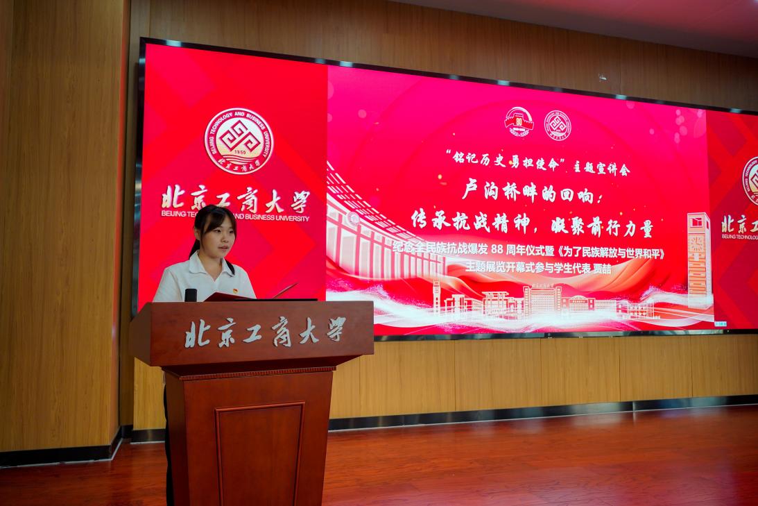 語言與傳播學院的賈喆,作為參加紀念全民族抗戰爆發88周年儀式的學生代表,以《盧溝橋畔的回響:傳承抗戰精神,凝聚前行力量》為題,帶領大家重回盧溝橋畔的肅穆現場。通過講述參加開幕式、參觀“為了民族解放與世界和平”主題展覽的活動經歷,她深刻領悟到中國共產黨在抗日戰爭中的中流砥柱作用,作為新時代青年,要將愛國情、報國志、強國行融入學業與實踐,以扎實學識開創未來,讓抗戰精神在擔當之中綻放更加耀眼的光芒。