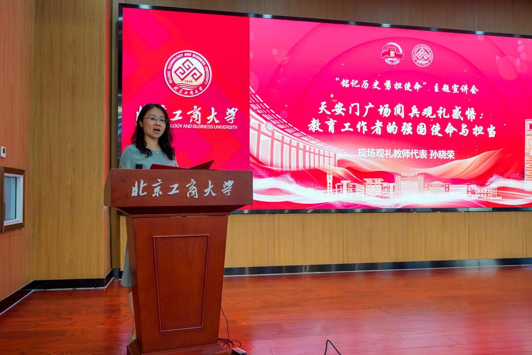 計算機與人工智能學院副院長孫曉榮以《天安門廣場閱兵觀禮感悟:教育工作者的強國使命與擔當》為題,動情分享了現場見證大國重器、鐵流滾滾的自豪與思索。作為教育工作者,她以“為黨育人、為國育才”的初心為基石,將“強國使命”融入教學科研的每一處。她表示,要引導學生將個人理想與國家戰略同頻共振,在人工智能、信息技術等前沿領域,以實際行動培養更多心懷“國之大者”的青年英才。
