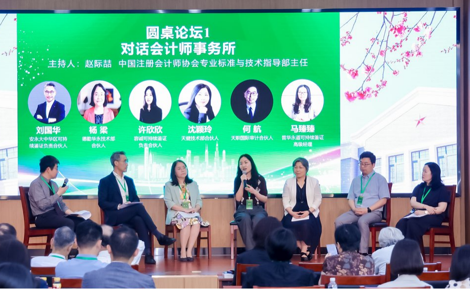 圓桌討論1——對話會計師事務所由中國注冊會計師協會專業標準與技術指導部主任趙際喆先生主持,嘉賓包括安永大中華區可持續鑒證負責合伙人劉國華先生、德勤華永技術部合伙人楊梁女士、容誠可持續鑒證負責合伙人許欣欣女士、天健技術部合伙人沈穎玲女士、天職國際審計合伙人何航先生、以及普華永道可持續鑒證高級經理馬臻臻女士。本次討論聚焦可持續信息鑒證領域的六大核心議題:鑒證范圍(部分指標與全面報告)、保證程度(有限保證與合理保證)、會計師事務所角色定位、鑒證意見側重點(公允性與合規性)、國際準則本土化適用性以及機構能力建設。其核心觀點是,市場對部分關鍵指標鑒證存在現實需求,但全面鑒證更能提升報告整體公信力;當前以有限保證為主流,但需推動可量化指標向合理保證過渡;公允性鑒證面臨企業量化能力不足和核算標準缺失等現實障礙。ISSA 5000為中國準則制定提供基礎,但完全基于財報審計邏輯,存在“不適合、不到位”之處,因此應當結合國情,制定有針對性、甚至引領國際的鑒證指南。此外,會計師事務所作為可持續鑒證的核心力量,應當通過“內外兼修”的方式持續提升專業能力:對內完善人才培養體系,在專業資格認證中嵌入可持續鑒證內容,建立持續教育機制,促進審計與咨詢團隊協同;對外構建跨領域協作網絡,與高校、科研機構及行業組織深化合作,共同提升可持續鑒證服務能力。