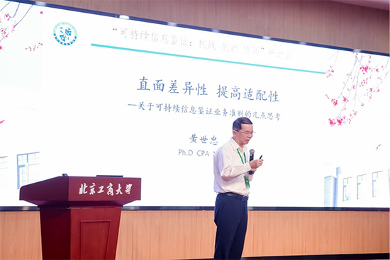 中國會計學會副會長、全國人大代表、廈門國家會計學院原院長黃世忠教授發表了題為“直面差異性,提高適配性——關于可持續信息鑒證業務準則的幾點思考”的主題演講。他系統分析了財務報表審計與可持續信息鑒證的異同,從目的一致性、信息關聯性等維度揭示了兩者的相似特征;從理論基礎、使用者需求、信息屬性和技術方法等層面闡釋了二者的本質差異。最后,他對可持續信息鑒證工作的推進,提出了“因應信息屬性差異,提出針對性要求”“規范價值鏈鑒證工作,明確協同要求”等十點建議。