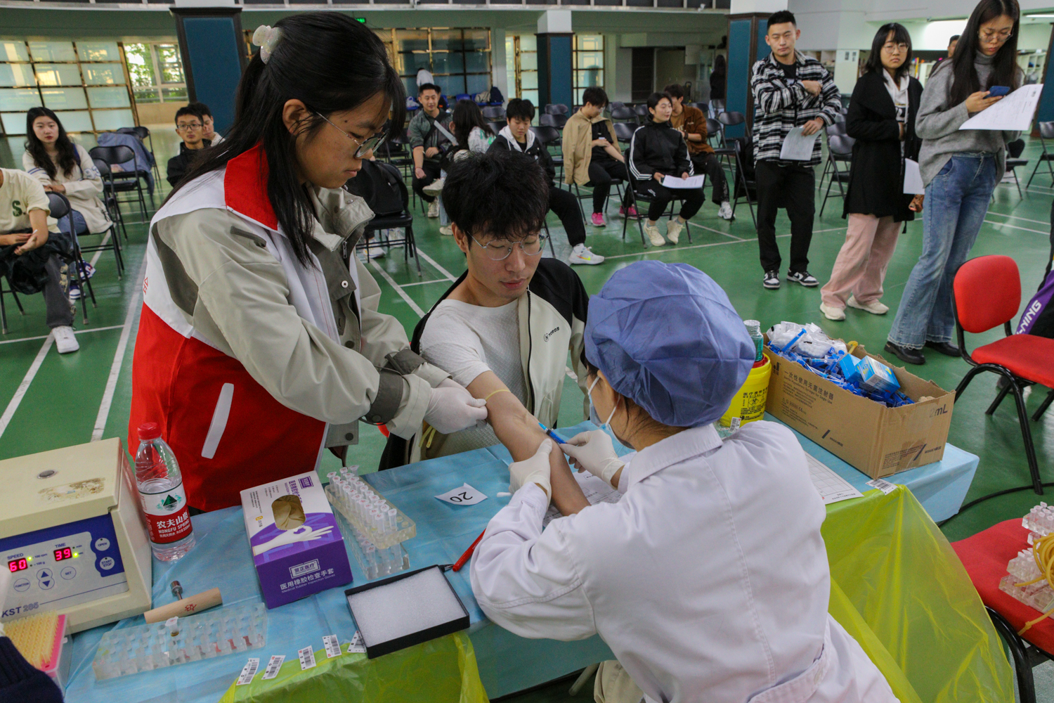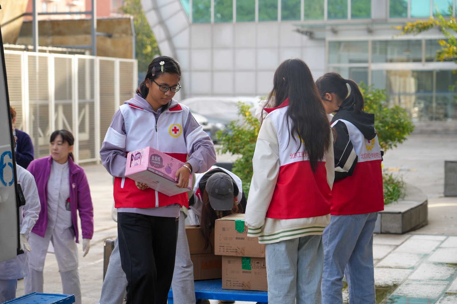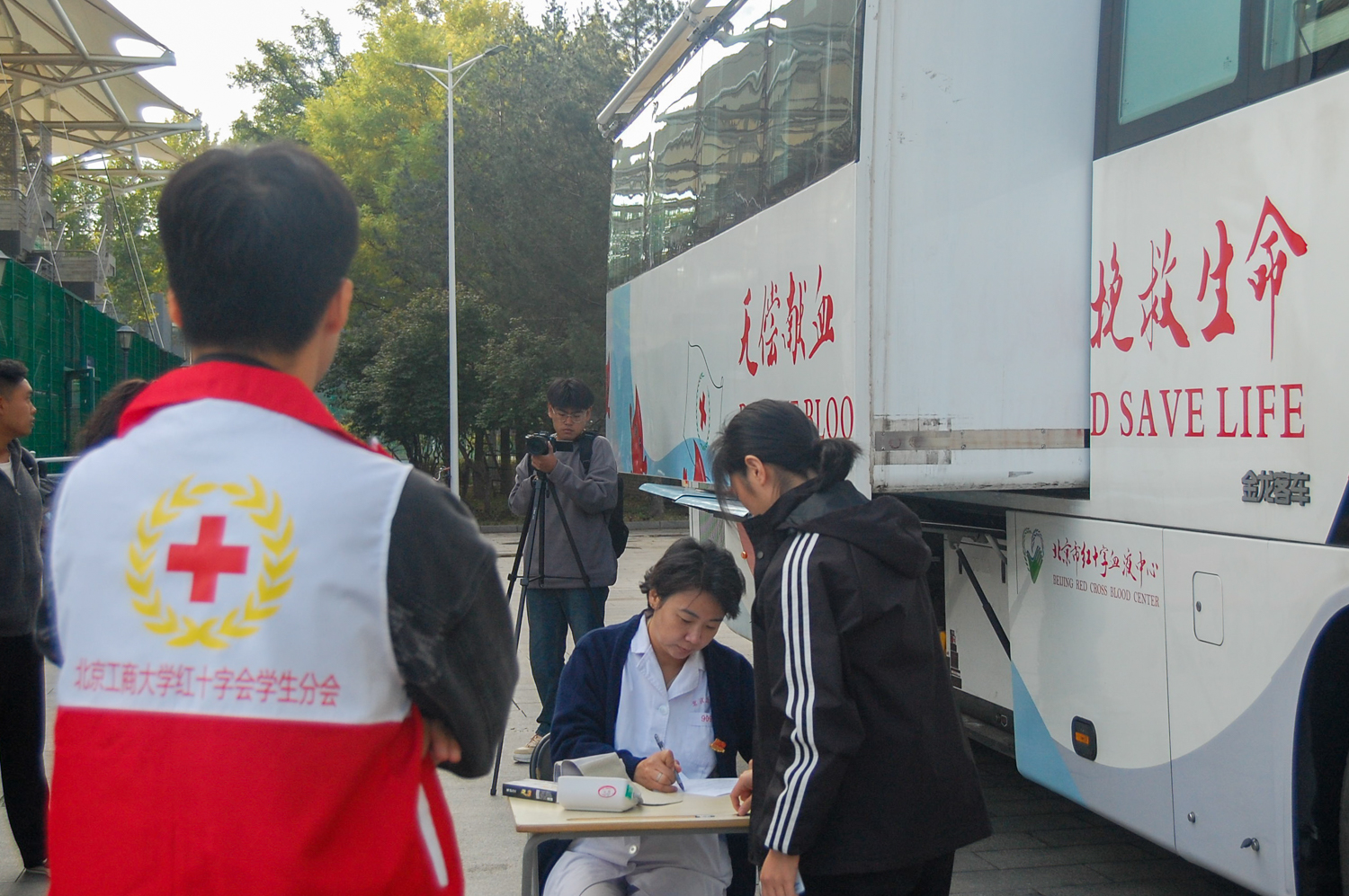 在此次活動中,在場館里穿梭的志愿者隊伍格外亮眼。他們身著統一的紅十字會志愿者馬甲,帶著親切自然的微笑,回答詢問,指引路線,搬運物資……他們使忙碌的現場井然有序,讓愛心在人與人之間傳遞,為活動更添溫情。我校紅十字會學生分會會長許嘉倫表示:“無償獻血是踐行‘奉獻、友愛、互助、進步’志愿服務精神的直接體現。作為新時代青年大學生,我們將繼續努力,讓志愿服務的旗幟在北工商飄揚”。談及對無償獻血活動的看法,許嘉倫認為:“這是一個非常有意義的志愿活動,不僅對自己的身體有益,可降低血黏稠度,促進新陳代謝。最重要的是可以為病患提供急需的鮮血,挽救他人的生命。希望有更多的老師和同學都來關心、支持無償獻血工作,讓更多的人行動起來,自愿加入無償獻血的行列中。”