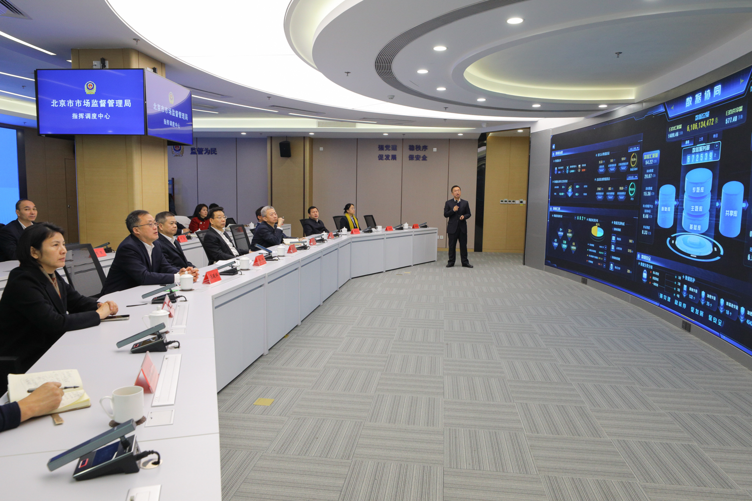 簽約儀式前,與會(huì)人員參觀了市市場(chǎng)監(jiān)管局調(diào)度指揮中心,深入了解智慧監(jiān)管平臺(tái)運(yùn)行與數(shù)字化創(chuàng)新應(yīng)用成果。大家通過(guò)市場(chǎng)監(jiān)管數(shù)據(jù)中臺(tái),重點(diǎn)了解全市市場(chǎng)監(jiān)管數(shù)字化改革、數(shù)據(jù)治理能力提升、助力經(jīng)營(yíng)主體高質(zhì)量發(fā)展、一體化綜合監(jiān)管改革、智慧監(jiān)管基礎(chǔ)能力建設(shè)等工作推進(jìn)情況。