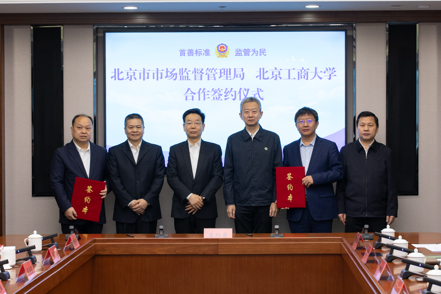 在高念東、沈千帆、李明、寇紅江的共同見(jiàn)證下,周小豐、郭建華代表雙方正式簽署合作框架協(xié)議,并合影留念,標(biāo)志著北京市市場(chǎng)監(jiān)督管理局與北京工商大學(xué)的戰(zhàn)略合作進(jìn)入新階段。