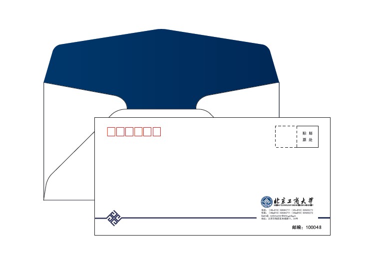 信封是傳達北京工商大學學校形象的媒介之一,本頁列舉DL號信封的使用規范,在實際應用中嚴禁對標識與名稱的組合方式、標準色以及設計版式做任何改動,郵政編碼格的位置及顏色標準按國家有關部門管理規定執行。