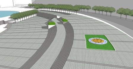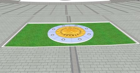 設計說明:景觀地標定位在求知廣場中軸線上,設計為總直徑4.6米,中心為直徑3米的銅鑄學校校徽,外面包圍一圈0.8米寬12mm厚鋼化安全玻璃,安全玻璃從銅LOGO向現狀地形找坡2%,銅鑄校徽高出現狀地面160mm。景觀地標為正圓形,安全玻璃平均分為八塊,每塊玻璃中心處做直徑300mm的藏地燈。