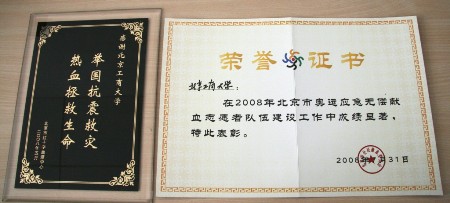 為表彰我校師生在地震災情發生后踴躍獻血的先進事跡,北京市紅十字血液中心向我校頒發了“舉國抗震救災,熱血拯救生命”先進團體榮譽證書、獎牌,并送來感謝信。