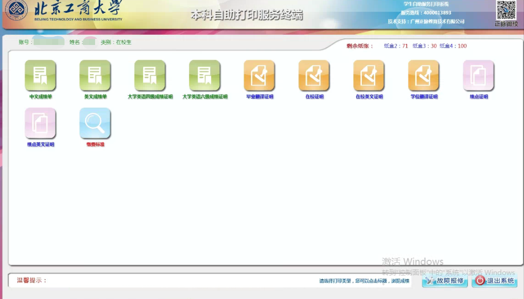 為了更好地滿足我校本科學(xué)生對(duì)于打印成績(jī)單、在讀證明等材料的需求,提供更加高效、便捷的服務(wù),在信息網(wǎng)絡(luò)中心、計(jì)劃財(cái)務(wù)處、公共事務(wù)處等部門的通力協(xié)作下,教務(wù)處安裝配置了四臺(tái)本科成績(jī)及證明自助打印設(shè)備。在校本科生均可根據(jù)個(gè)人需求,通過(guò)自助打印機(jī)打印相關(guān)材料,現(xiàn)將相關(guān)事項(xiàng)通知如下: