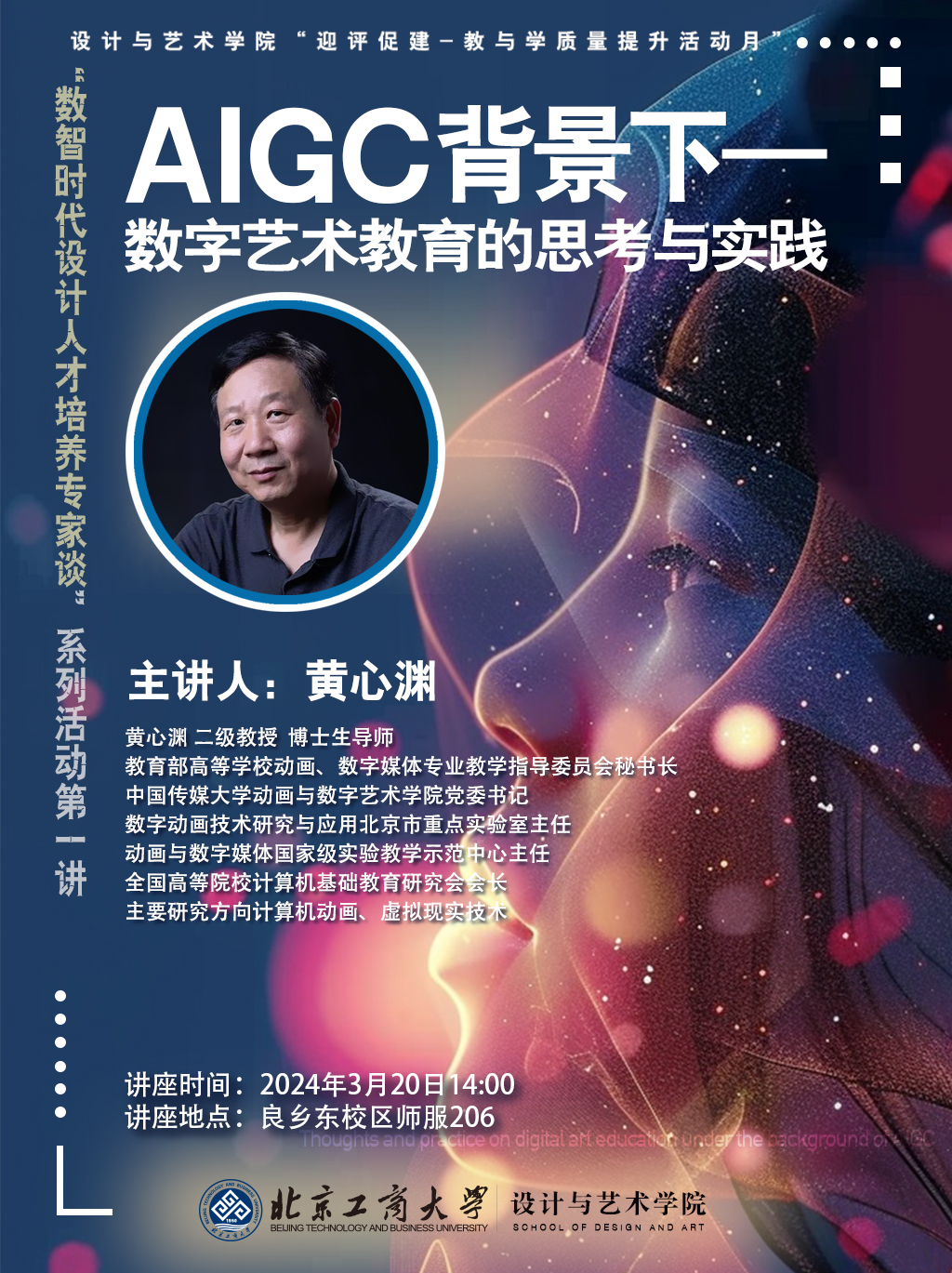 3月20下午,設計與藝術學院舉辦了“迎評促建—教與學質量提升活動月”之“數智時代設計人才培養專家談”系列活動第一講,邀請教育部動畫與數字媒體專業教指委秘書長、中國傳媒大學動畫與數字藝術學院黨委書記、數字動畫技術研究與應用北京市重點實驗室主任、動畫與數字媒體國家級實驗教學示范中心主任、全國高等院校計算機基礎教育研究會會長黃心淵教授蒞臨指導。學院黨委書記王海偉、副院長劉紅菊以及專業師生代表參加了本次講座。