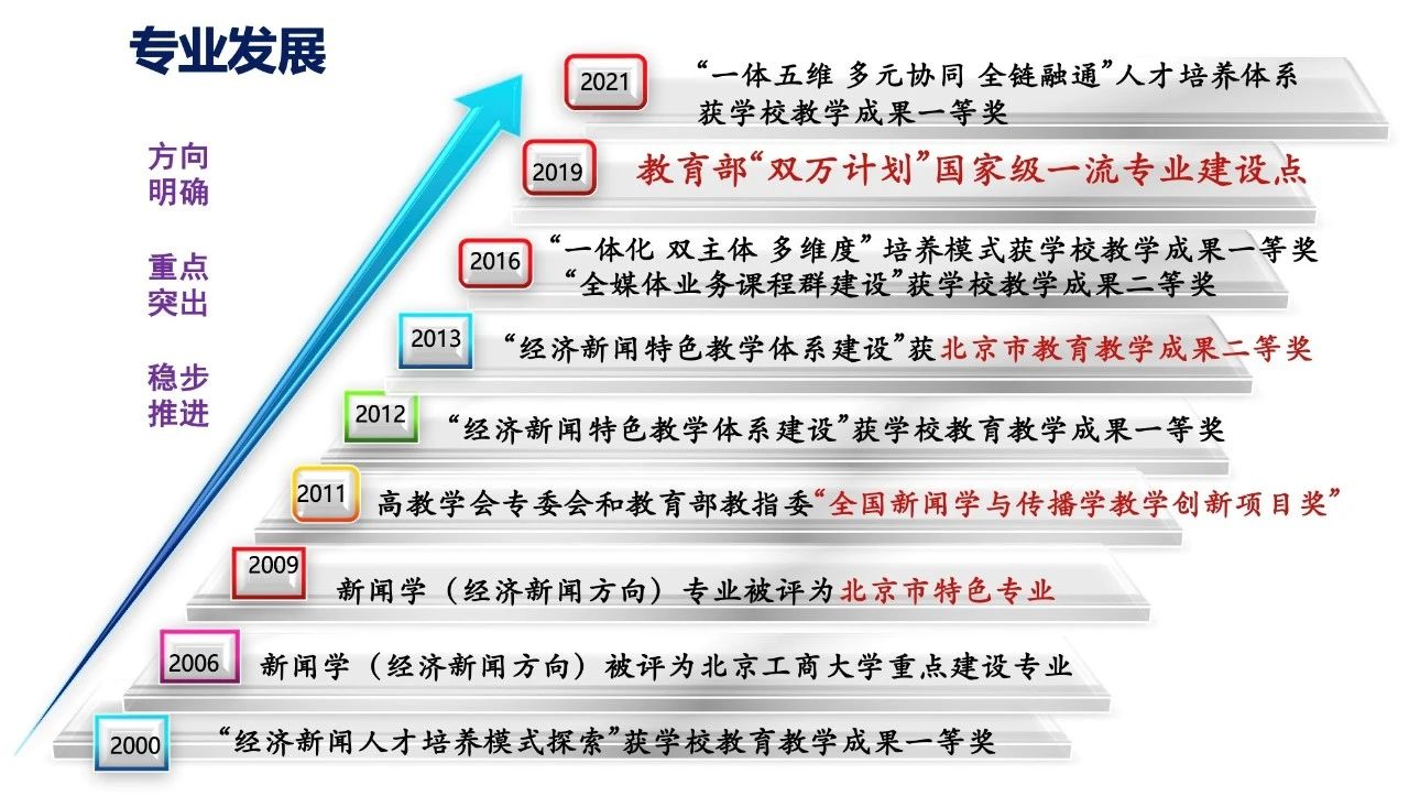 1997年,我校新聞學專業創建并率先進行經濟新聞特色辦學;2006年被評為學校重點建設專業;2009年成為北京市特色專業建設點;2011年,“經濟新聞特色教學體系建設”獲教育部新聞學科教學指導委員會、中國高等教育學會新聞學與傳播學專業委員會聯合頒發的“全國新聞學與傳播學教學創新項目獎”;2013年該項目獲北京市高等教育教學成果獎二等獎;2014年本專業被確立為學校本科教學綜合改革示范專業;2019年入選首批國家級一流本科專業建設點。