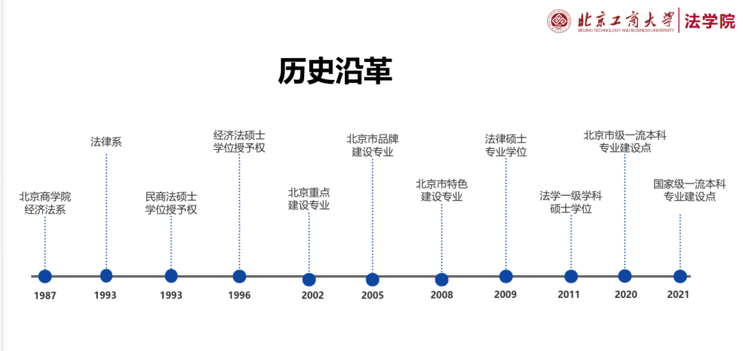 法學專業始建于1987年6月,1987年原北京商學院設立經濟法系,1993年經濟法系改名為法律系,在全國首次招收商法專業本科生,同年,取得民商法學碩士學位授予權,1996年取得經濟法學碩士學位授予權。2002年被批準為北京市重點建設專業,2005年被確立為北京市品牌建設專業,2008年被批準為北京市特色建設專業。2009年獲得法律碩士專業學位授予權,2011年獲得法學一級學科碩士學位授予權。2020年入選北京市級一流本科專業建設點。2021年入選國家級一流本科專業建設點。